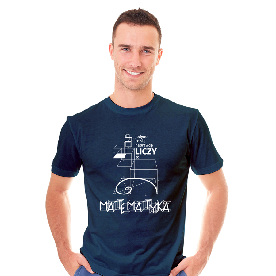 Granatowy, męski T-shirt z matematycznym nadrukiem to część garderoby, której nie może zabraknąć u każdego fana matematyki. Klasyka i elegancja w najprostszej możliwej wersji.